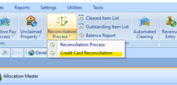 On the ACTIVITIES menu, the RECONCILIATION PROCESS icon is divided into top and bottom. If you click the top of the icon, the normal Check Book Reconciliation will open. If you click the bottom of the icon, a choice of the normal reconciliation process and the new credit card reconciliation will be displayed.