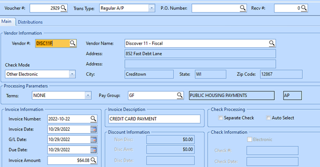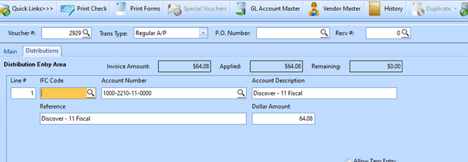 - The Distribution line will use the CC liability account entered in the Checkbook.