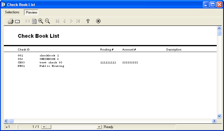 When the preview button is depressed, the listing of checkbooks may be viewed on screen.