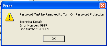 To remove the checkmark properly you must remove the password information first; otherwise, when you try to save the file without a checkmark in the Require Password box, you will see the following message: