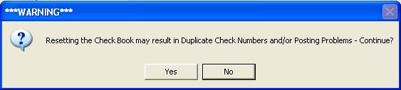 Click Yes to unlock the checkbook. This step should only be taken in extreme circumstances. The better solution is to have the user go into the Check Processing Wizard where they can cancel or post their check information which will unlock the checkbook for other users.