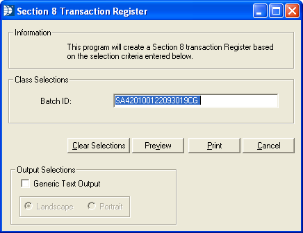 Go to Activities>>Section 8 Accounting Preparation>>Section 8 Accounting Post - Click Yes to print transaction register.