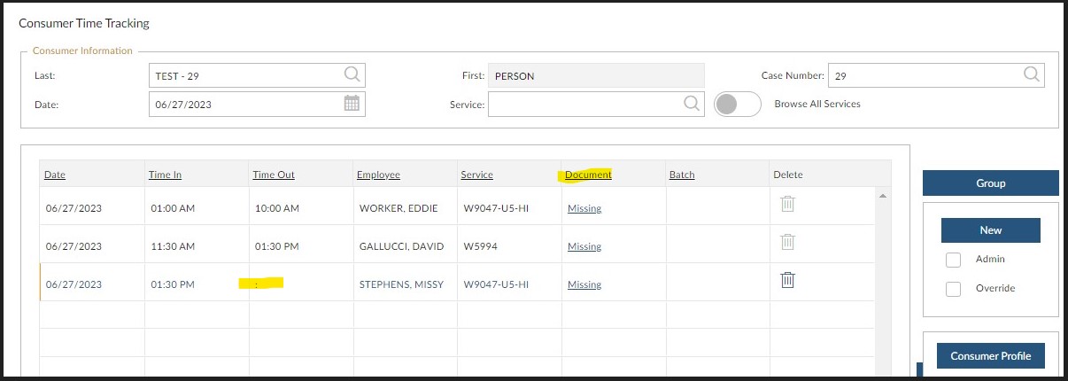 - On the Consumer Time Tracking screen, you will see the entry in the grid without a TIME OUT listed.