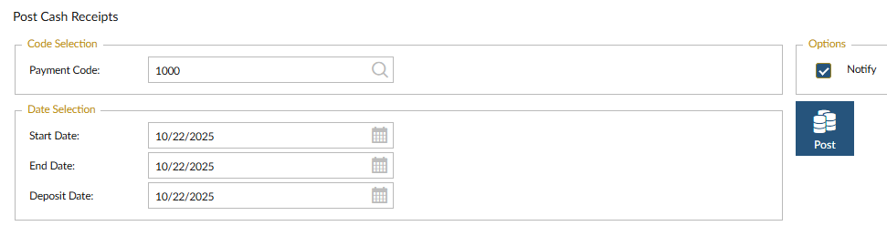This process will post cash receipts in the system. This process should be run when a bank deposit is made. Remember, at this point in the process the cash receipts include any payor (PROMISe) payments and cash payments received.