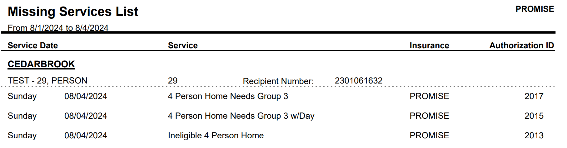 The Missing Services List for the time frame 8/1 to 8/4 shows three lines for 8/4. Because the Test Person has a with, without, and ineligible authorization, the system assumes there should be attendance. Since no attendance is entered for 8/4, this report shows all daily authorizations. Review the day and enter the billable attendance or therapeutic/medical day.