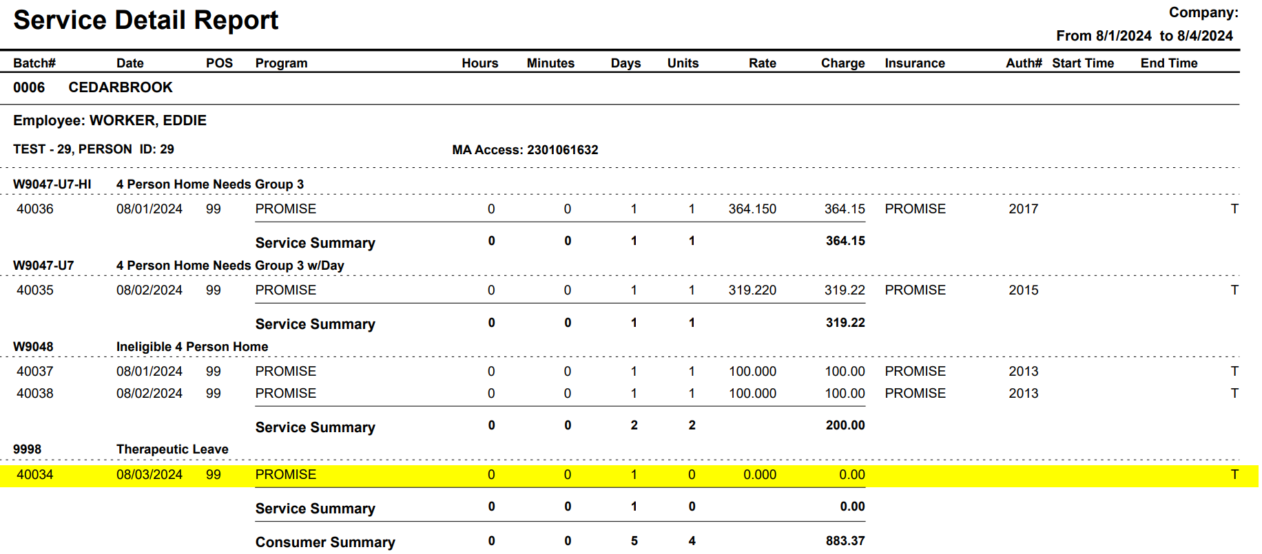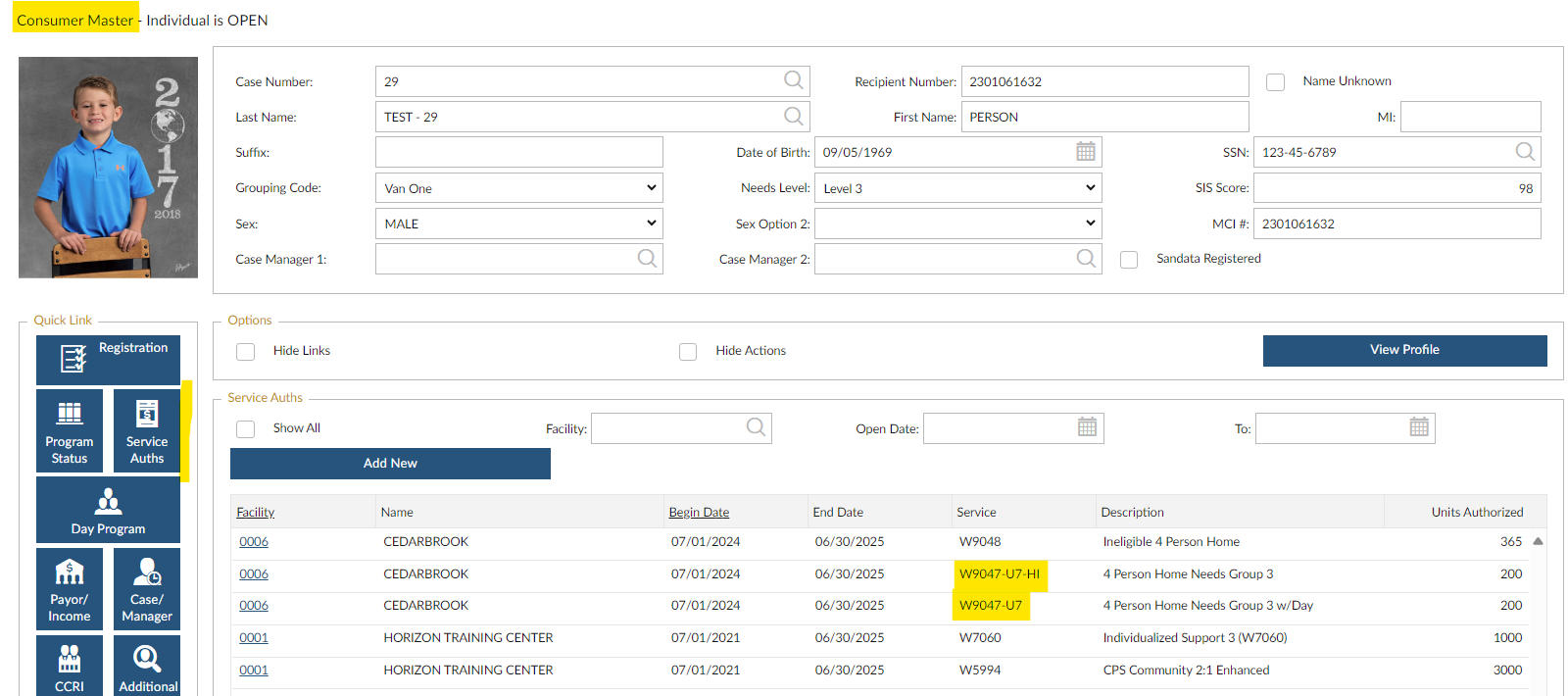 In this example, the Test Person is authorized for a with and without daily residential service code.