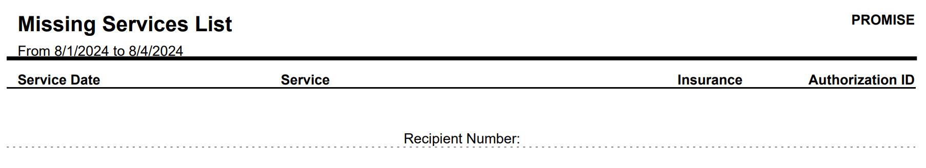 This report is to monitor residential day services. This report will show if an individual has a daily residential service authorization but no attendance is recorded. Before generating the billing file, review all dates this report to determine whether or not an attendance entry needs to be added. If everything is accurate, the report will be blank.