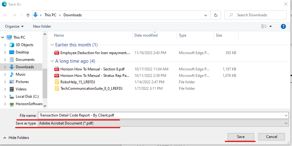 Follow the steps below to save an electronic copy instead of printing. This will allow you to quickly and easily find records for audits, employees, etc. Make sure to create a folder structure that you can find your reports later.