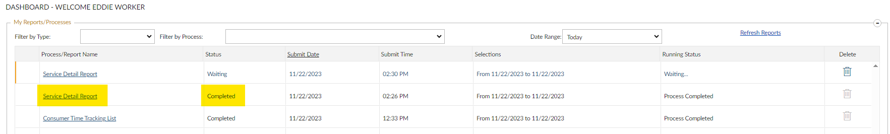 - An informational prompt will appear noting "Report Submitted for Processing". Click OK.