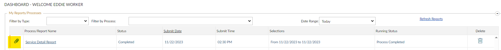 - When the STATUS column shows COMPLETED, the first column will show a paperclip