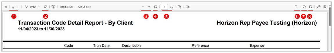 Once the report is opened, the following options will be available. This example is using Microsoft Edge internet browser.