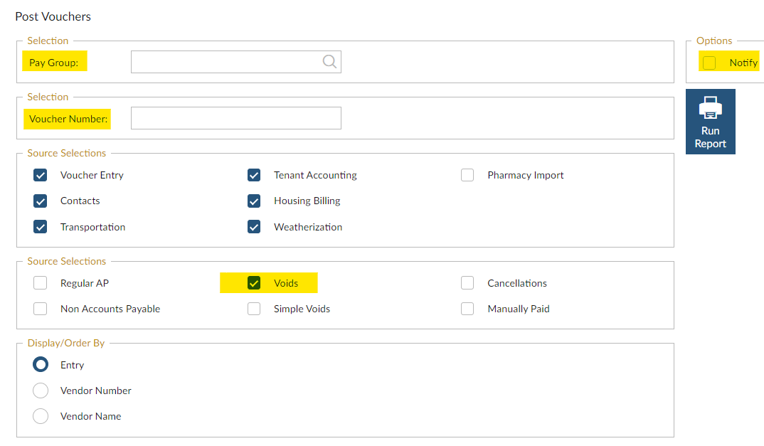 - Voucher Number: enter a specific voucher number to post one voucher from among many. If posting all vouchers, leave this field blank.