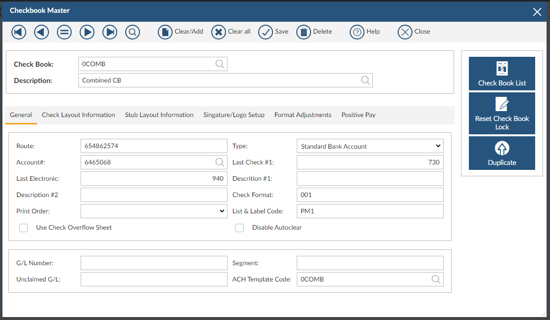 NAVIGATION: MAINTAIN menu > Master Tables > Miscellaneous Tables > Check Books