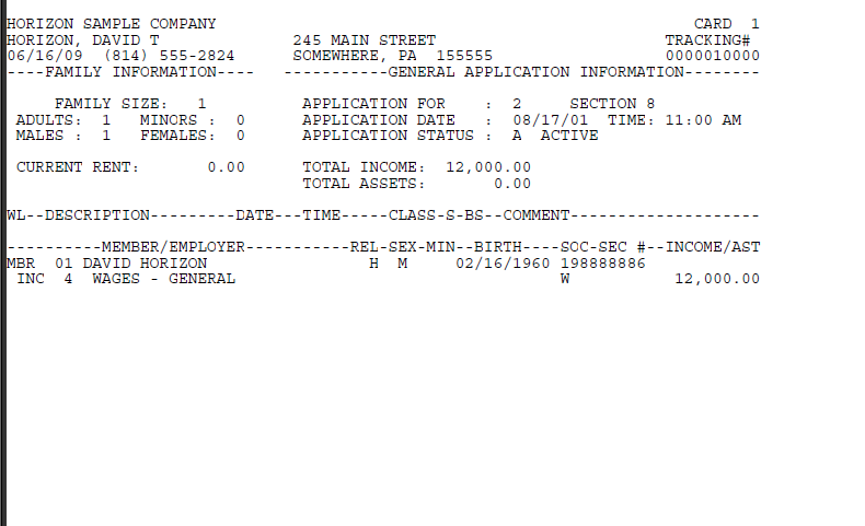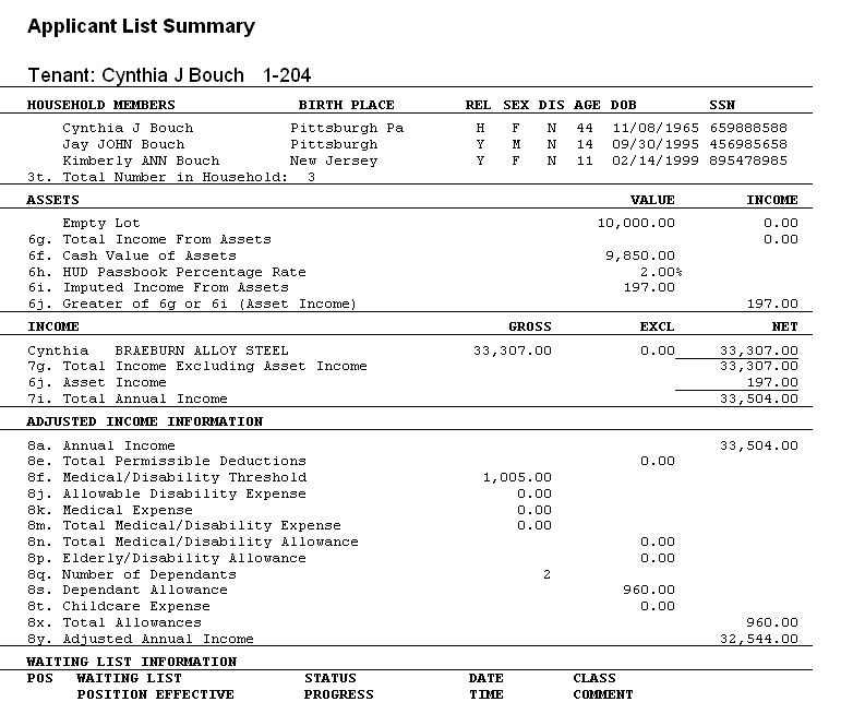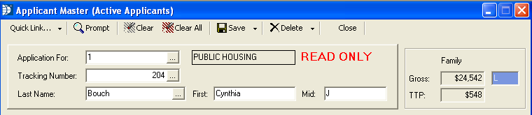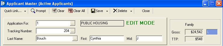 This program is used to enter and maintain Applicant records, perform rent calculations, create and print 50058 forms, assign waiting lists to applicants, and other applicant functions.
