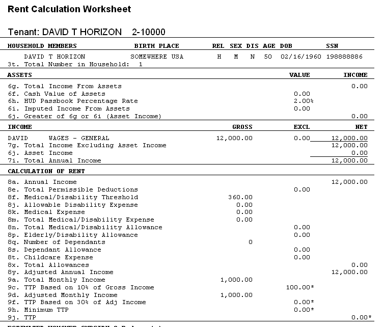 Selecting one of the scenarios will print a hard copy of the selected scenarios from the public housing, section 8 or section 8 voucher tabs from the rent calculation. The worksheet shows household composition, income, calculation of rent and the rent information for each scenario selected for printing.
