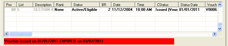 This window is in the middle of the Applicant Master Screen and displays information for the head of household and other members of the household that have been entered in the Household Composition program. It shows the Member Number, member’s Status, Name, Relation to the head, Sex, Age, Date of Birth, and Social Security number. Scroll bars to the right and at the bottom enable viewing of all information. Click here for information on Household Composition.