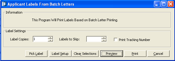Press the Print Labels button after selecting Applicants in the grid to open the Applicant Labels From Batch Letters view.
