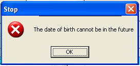 Birthdates that are prior to 1930 will be validated if entered in a mmddyy format. They will return a date in the future. If a birthdate is entered as 123129 the date will be shown as 12/31/2020 and the following validation message will be displayed: