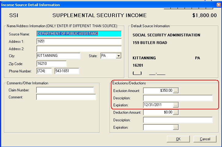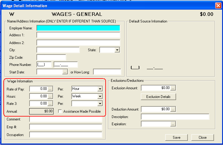The program has fields for entering employer information for the income. The source information does not need entered here if the default source information is correct and shown on the right side. The source (default or entered) information will merge into forms/letters for verification purposes.